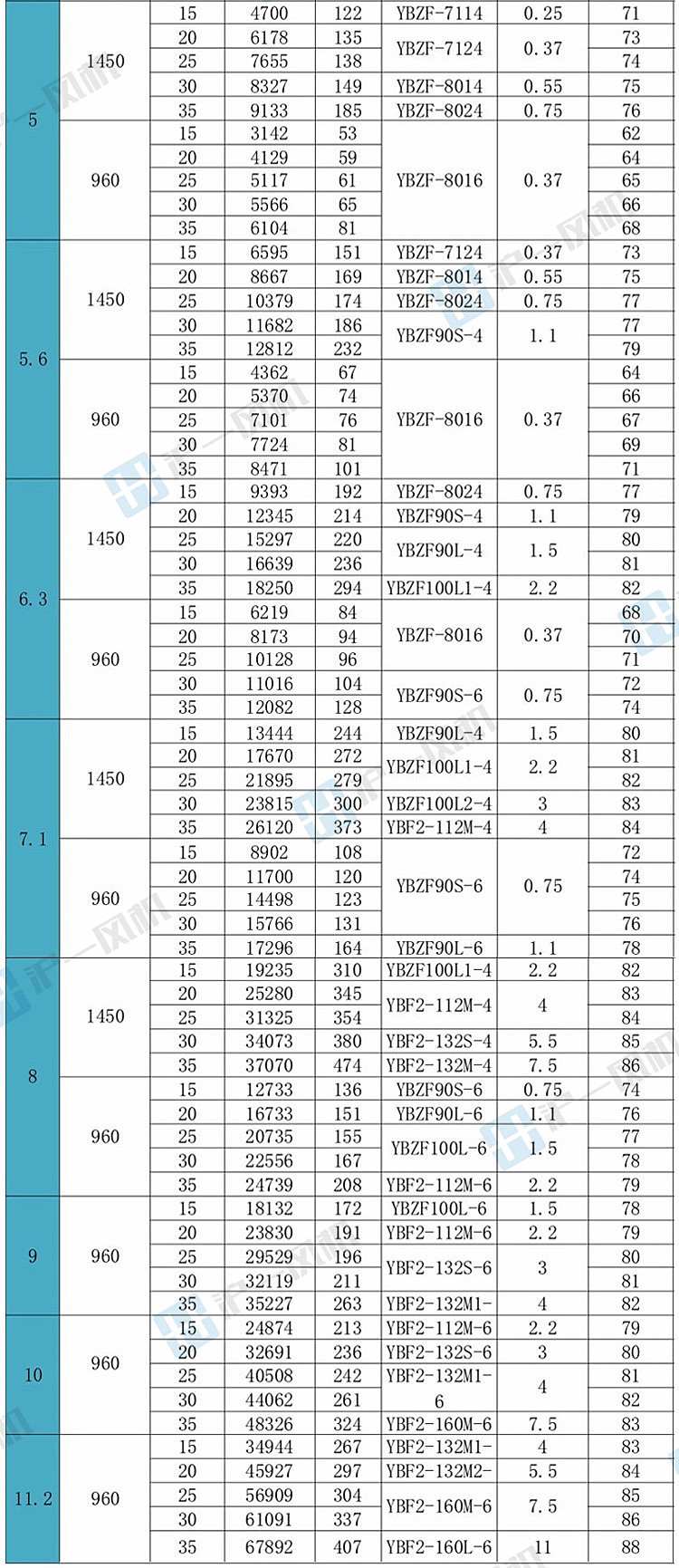 2.8/3.15/3.55/4/4.5/5/5.6/6.3/7.1/8/9/10/11.2#风量800-70000m3/h,功率0.04-7.5KW,能满足绝大部分客户参数