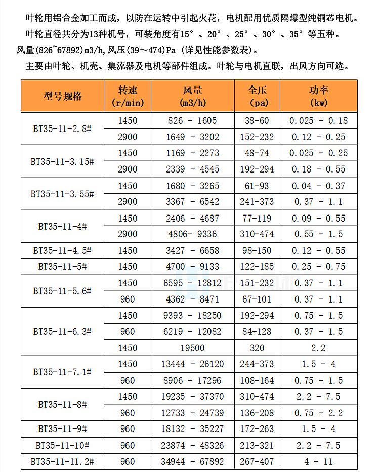 简要描述:HUYIFAN防爆风机定制是由风筒(可做不锈钢、玻璃钢、铁壳)、铝合金风叶和隔爆型防爆电机研制而成,防爆风机 bt35 11n355的规格齐全2.8/3.15/3.55/4/4.5/5/5.6/6.3/7.1/8/9/10/11.2#风量800-70000m3/h,功率0.04-7.5KW,能满足绝大部分客户参数要求。定做优质防爆风机